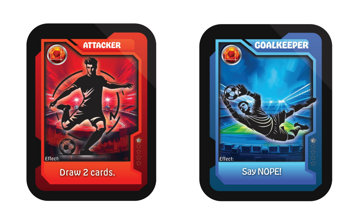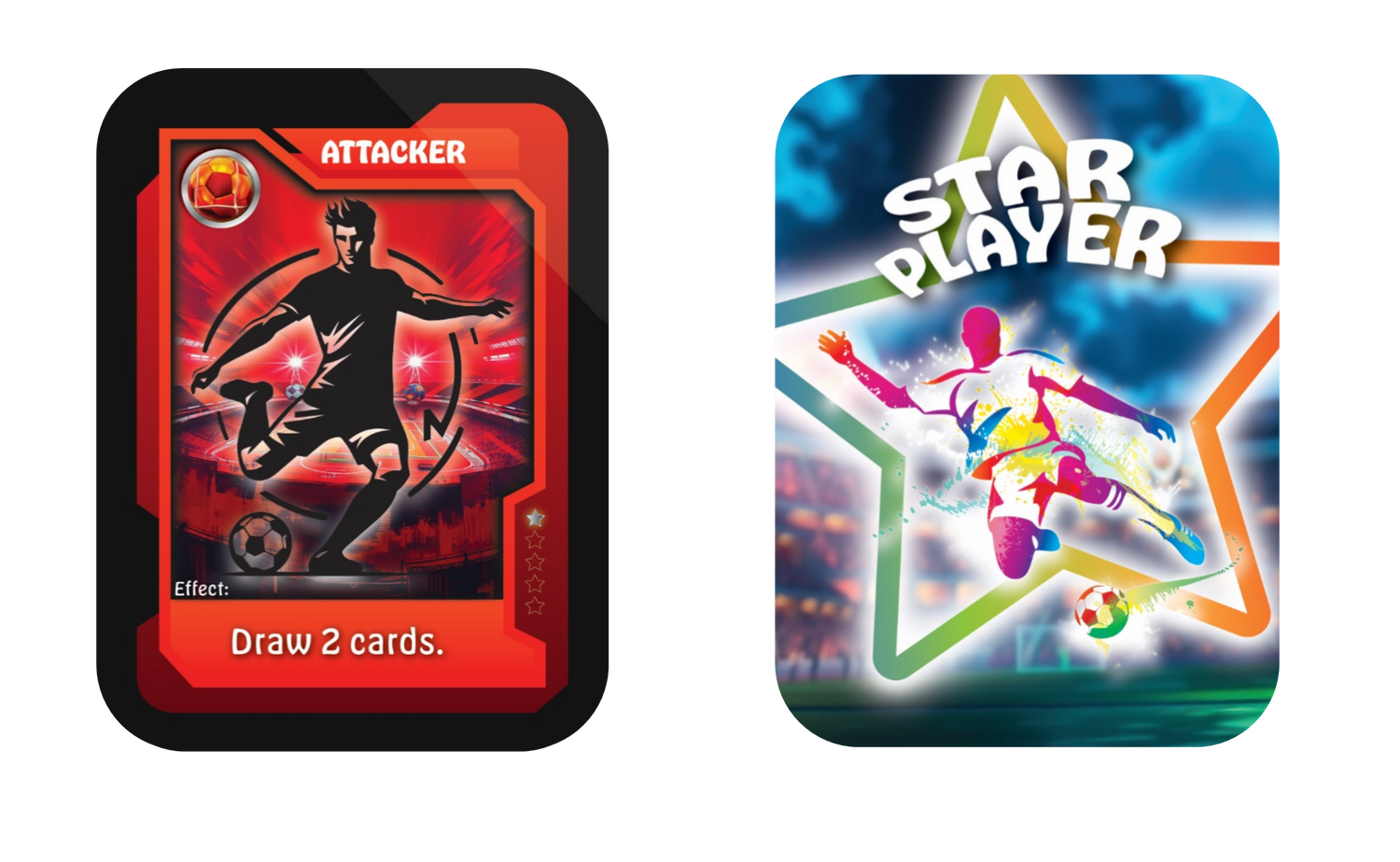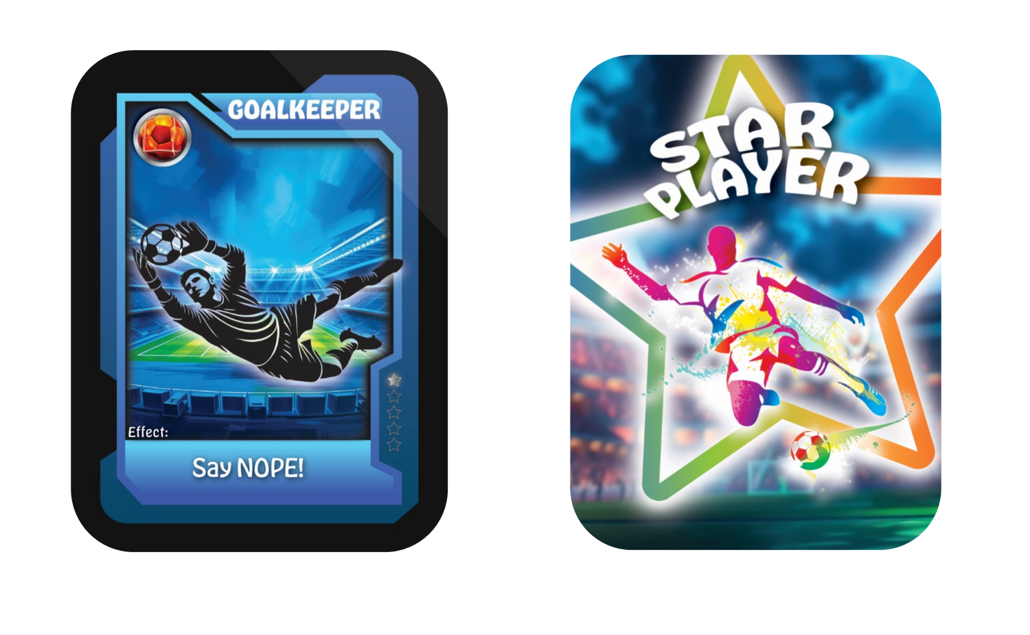 Place player cards, goal cards, or tiki-taka cards to build up your field and use later — they can be targeted!